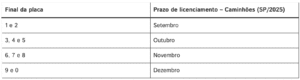 Para caminhões e caminhões-tratores, o calendário de licenciamento em São Paulo em 2025 foi dividido da seguinte forma: placas com finais 1 e 2 tiveram prazo em setembro; finais 3, 4 e 5, em outubro; finais 6, 7 e 8, em novembro; e finais 9 e 0, em dezembro. Com o prazo se encerrando, o Detran recomenda a regularização imediata para evitar multas e prejuízos operacionais no transporte de cargas.