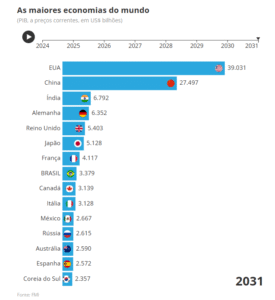 Veja abaixo a evolução dos PIBs das maiores economias do mundo, conforme as mais recentes projeções do FMI, que vão até 2031: