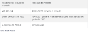 Para rendas entre R$ 5.000,01 e R$ 7.350, há uma redução parcial e decrescente do imposto: