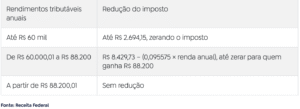 - redução gradual do imposto para rendas entre R$ 60.000,01 e R$ 88,2 mil;