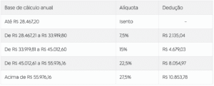Tabela anual de isenção e redução do IR